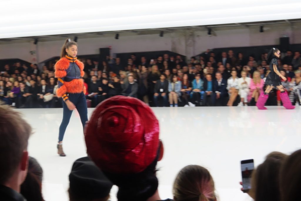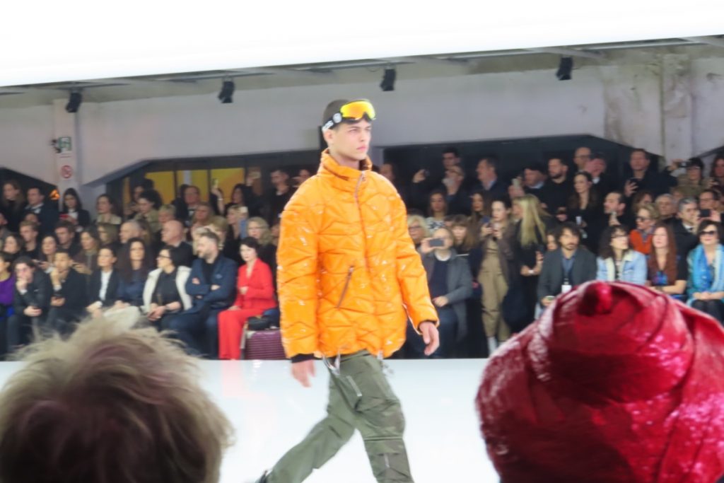 Moving from puffer jackets to skin tight dresses the brand is positioning itself as high end sportswear and streetwear for the bling set. Embellishments, geometrics prints, 3D projections were on full show.